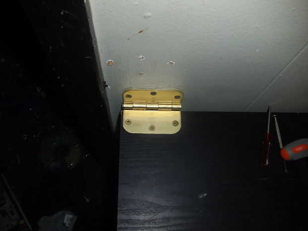 segundo paso; Monte las dos bisagras en un lado de la mesa (ver foto) entonces simplemente Monte la mesa bisagras a una pared, utilice una regla para su nivel.