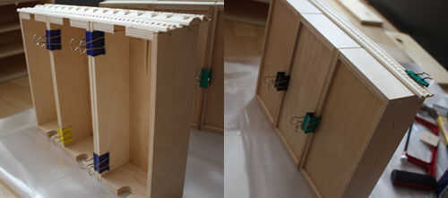 Coloque los tres cajones superior junto con el pegamento para madera y sujetarlos. Utiliza clips de carpeta de tamaño medio y trabajaron maravillosamente. Nuestros embarcaciones de madera pegamento dijo a durante 1 hora y dejar reposar durante 24 horas. Yo no tenía la paciencia así que póngalos, afianzado con abrazadera, para un par de horas mientras que hice otras cosas. Fueron muy fuertes por el tiempo que estaba listo para usarlos.