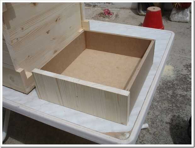 Cajones fueron hechos de MDF de 1cm y pino para el frente. El fondo del cajón es un panel MDF de 3mm insertado en una ranura.