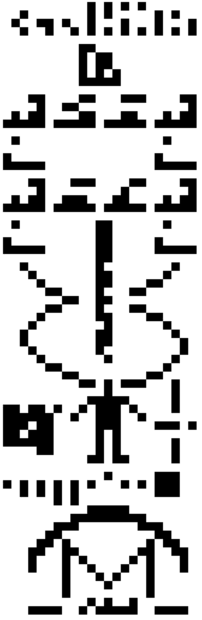 En 1974, los astrónomos algunas un mensaje kilobit 1,6 de la antena de radio de Arecibo. El mensaje consistía en un bitmap de 73 x 23 (números primos) que contiene información codificada sobre los seres humanos, nuestra estructura básica y la de nuestro sistema solar. Que las estrellas en que se observó eran 25.000 años luz de distancia, dudo obtendrá una respuesta cualquier momento pronto, pero llevar a algunos interesante pensando en cómo codificar la información por lo que puede ser obtenido por alguien sin tanto conocimiento de la estructura o contenido.