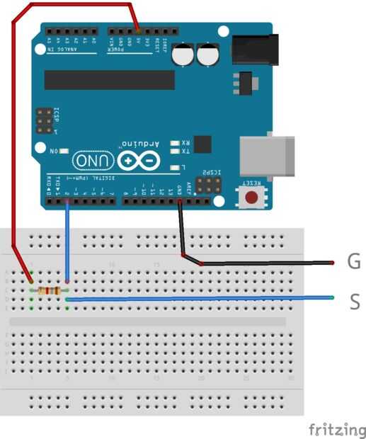 El enganche sólo real para lo Arduinoist es que la línea de señal requiere una señal de "fuerte" pull-up, que descarta el uso de los internos. Se trata de algo en la gama de 4,7 K - 8,2 K ohmios de alambre. Estoy usando una resistencia de 6,8 K ohm. Véase el esquema si no está seguro de cómo funcionan los pull-UPS. Básicamente garantizan que la línea de señal es de 5 voltios a menos que una señal tira baja.