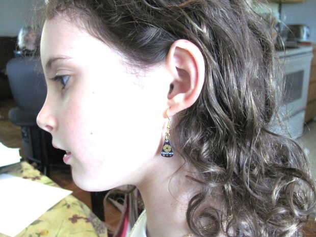 Me perforó un pequeño orificio en la parte superior y poner un anillo de 6mm en él. También redondea y alisa los bordes un poco. Consiguió amar Dremels! Después de eso, fue aretes o un collar. Ninguno de mis mujeres favoritas han reconstruido orejas, así collares que será.