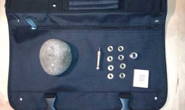 A continuación, utilizar la herramienta de roca y ojal para poner los ojales en su bolso. Poner la pestaña de la arandela en la parte delantera de la bolsa y la arandela en la parte posterior de la aleta del bolso para un look más limpio.