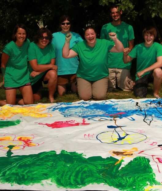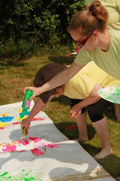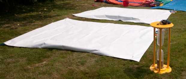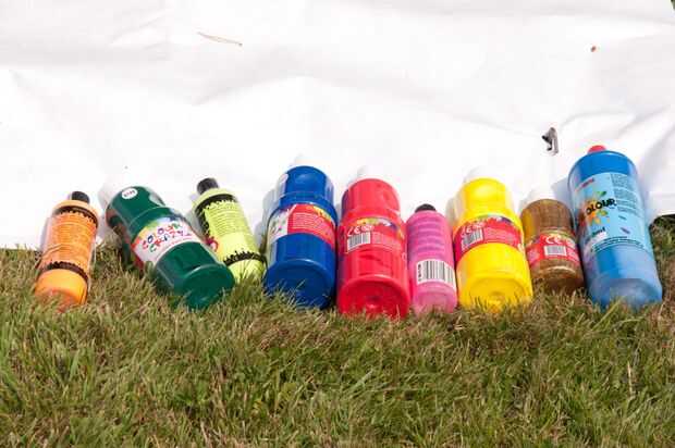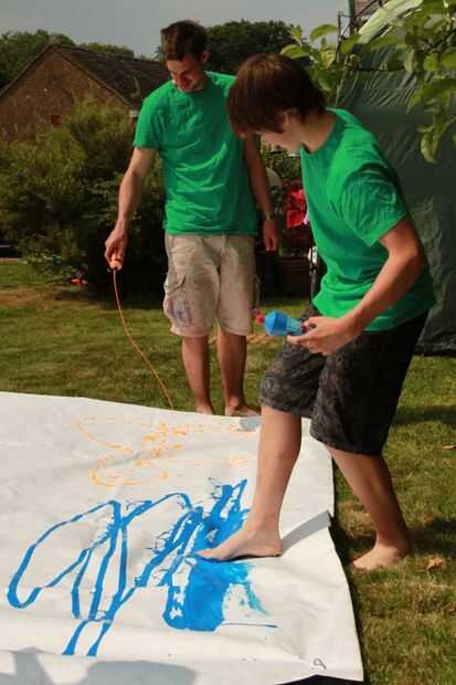 Ofrecemos una gama de pinturas de cartel en una gama de colores y unas placas de papel que pueden ser arrojado a chorros en demasiado a. La pintura se hace en una hoja grande de papel. Para esto tuve la suerte que el extremo de un rollo de blanco Tyvek láminas podría utilizarse, pero fácilmente podría ser don en una sábana vieja o en forro de papel pegadas juntas. El tamaño necesario depende de la cantidad de personas, para el 16 o así un área 3 x 3 m que significa la mayor parte del equipo de la gente que puede estar haciendo algo al mismo tiempo.