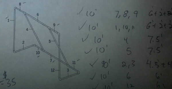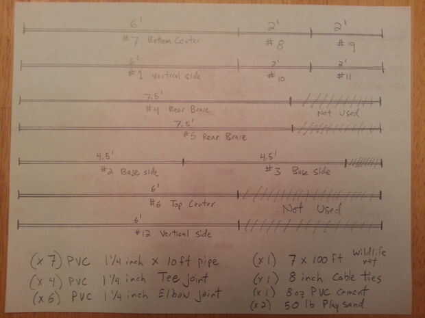 Me ha gustado un diseño apoyado. He utilizado los tubos de PVC de 10 ft. Siete de ellos. A continuación algunos Tee y codos. Las imágenes muestran los números de parte y colocación. Por ejemplo, en una tubería de 10 pies, puedo conseguir una 6' pieza ft plus (2) piezas de 2 pies. Hubo algunos tubos no utilizados, pero que fue el costo de hacer negocios.