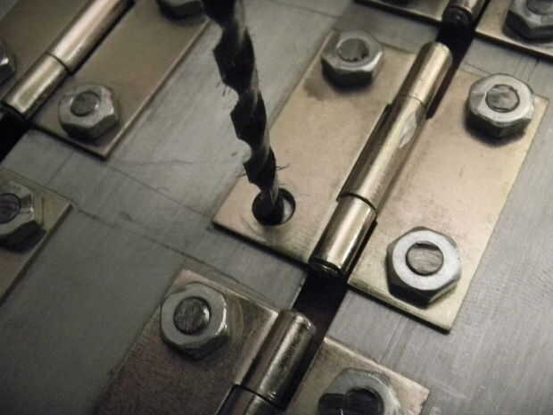 1 bisagra tiene 4 orificios y hay 6 bisagras en un lado por lo sería 24 tuercas y tornillos. Ahora veces por 2 porque hay 2 lados así sería 48 pernos y tuercas. . eso es un montón de perforación de pozos, tuercas y tornillos. __.