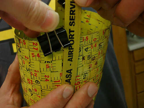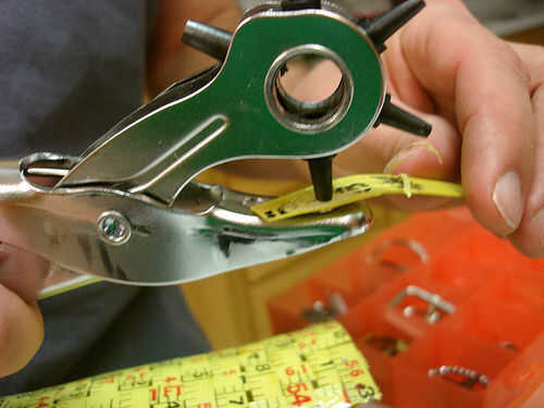 Para la manija elegí un pedazo de tira que mi marido había mantenido desde el aeropuerto de Indonesia de Bali.  Medí la longitud que necesita poner en la botella de vino y asegurándose de que podría conseguir la botella dentro y fuera.  Para fijar la manija pongo un agujero en la tira con una perforadora de cuero.  Entonces conecté el mango mediante un remache.  No pasó a través del metal ya que es muy frágil, pero en cambio fue entre dos tiras.  Quería poner 2 remaches en cada lado, pero mi arma de remache se rompió después de poner sólo 1 en cada lado.  No parece que importa aunque cuando usé la bolsa.