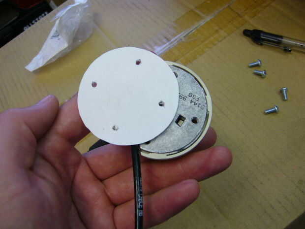 Primero tuve que recortar un poco de la circunferencia del agujero original en la placa superior (marcado en rojo) para limpiar los orificios de montaje en la base de la lámpara de la inducción.