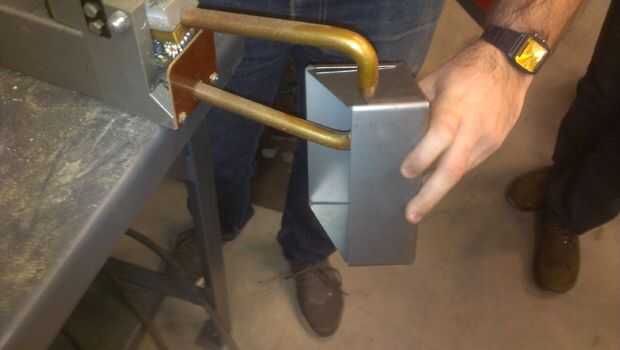 Colocar la parte donde desea colocar una soldadura.  El soldador del punto trabaja ejecutando una corriente entre los dos electrodos de cobre.  Basta con aplicar la corriente para un segundo o dos hacer las soldaduras.