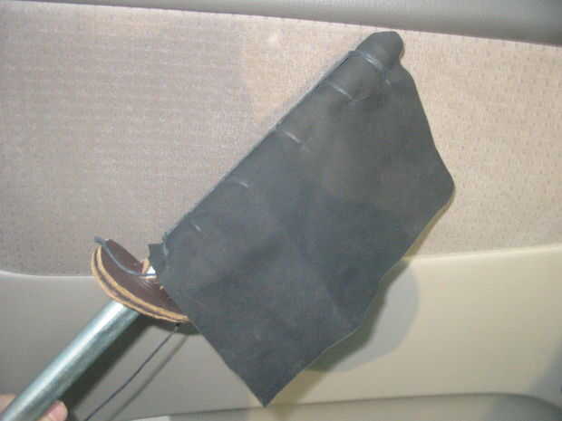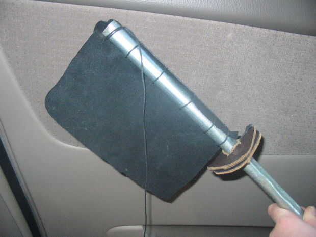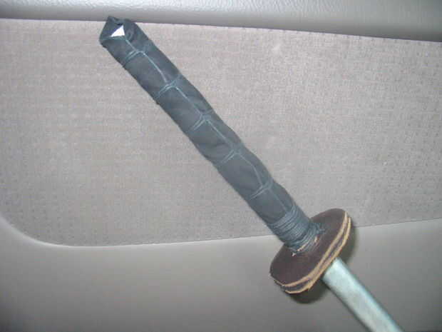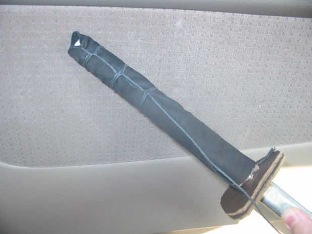 En primer lugar, cortar 6" pedazo ancho de cuero mientras que el extremo de la manija de la espada. Luego, con las tijeras, cortan varios agujeros 1 a 1 1/2 pulgadas en el lado de longitud de mango. Hacer los agujeros de 1 pulgada desde el borde a partir de 1/4 de pulgada desde el final.
