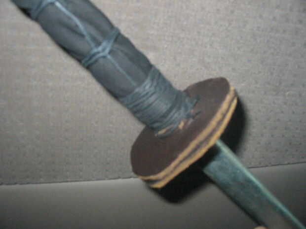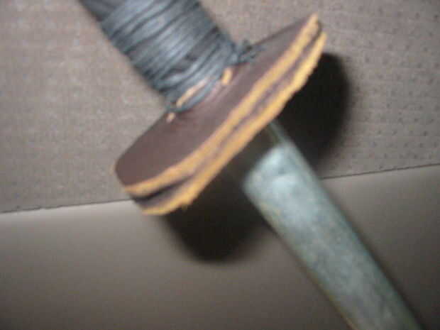 Una vez que su piel ha sido cortada con el tamaño correcto y llenos con agujeros, no llenados pero cuando penetra los agujeros, use el cable para un nudo a través y alrededor de la piel por lo que bien está unida a la manija como se ve en la imagen 1. A continuación, con un "punto de funcionamiento," atar el cuero a la manija tan ajustadamente como sea posible. NO CORTE EL CABLE. Una vez haya terminado, envuelva el cuero ahora consolidado alrededor de la manija (Fig. 2) y utilice un ballestrinque para atar el extremo de la piel en el extremo de la manija (Fig. 3). Luego use un ballestrinque cada 1 a 1 1/2 pulgadas para arriba hacia el protector de mano. Al llegar a 1/2 a 1/4 de pulgada desde el protector de mano, mantenga atar el ballestrinque repetidamente hasta que aparezca el protector de mano (Foto 5).