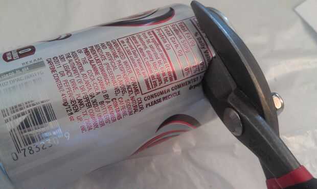 Recoger tus latas vacías sobrantes y asegúrese de que están completamente vacíos que sería incluso láveselos con agua corriente para salir de cualquier viscosidad de soda u otra bebida. Después de la reunión consigue un par de tijeras, tijeras son ideales pero puede funcionar un par de tijeras fuertes.