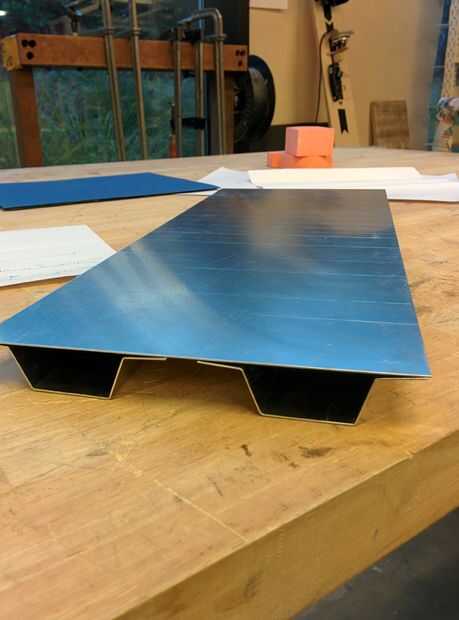 He utilizado una hoja de aluminio de 0, 8mm y una superficie de 500x500mm. El aspecto más importante del grupo es dándole fuerza añadiendo perfiles está por debajo. Piense en una caja de cartón. Es básicamente papel, pero con la onda como patrón dentro, es mucho más fuerte.