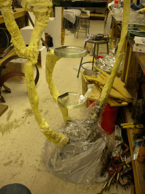 Para los brazos, yo simplemente había tamizado de los áridos (piedras) fuera de la mezcla de concreto de fraguado rápido y aplicado con un raspador de arcilla (funciona cualquier pequeño objeto flatish). Quitar el agregado permite adherirse a la espuma, y fui capaz de conseguir que aplique verticalmente. Para usos de boca abajo, lo hice simplemente lo que hice con la espuma expandy: puse un montón de cemento en alguna envoltura de plástico y envuelto en su lugar hasta que seca. Esto es mucho más fácil de hacer - el cemento se endurecerá en plástico, por lo que ningún proceso raro para sacarlo. Este proceso también deja una superficie vidriosa en el cemento, si usted está en eso.