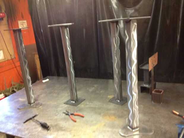 Usando un soldador MIG para acero soldar las piezas superior e inferior de las patas de metal pulidas metal.  Asegúrese de virar soldadura primero y luego hacer más grandes las costuras de la soldadura primero en la pieza inferior luego la parte superior.  Orientar verticalmente y centro para asegurarse de que las piernas no son torcidas.  Calor puede hacer que la pieza base a algo que puede ser compensada más tarde con el material del separador en la parte inferior de las piernas.