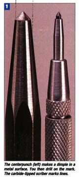 El hoyuelo abandona evita el taladro hace girar alejándose del punto a taladrar, más sobre esto en un momento. Marcadas las marcas metal brillante son difíciles de ver, para un recubrimiento de secado rápido diseño azul del tinte se utiliza para proporcionar contraste. Las líneas que se describen a continuación en la superficie cubierta soporte agudo y brillante. En un sujetador, un marcador de punta de fieltro negro se puede sustituir por el tinte (Foto 2). Utilice el tipo de rotulador que está diseñado para marcar diferentes tipos de materiales. En hierro negro o acero laminado en caliente, utilice un marcador de metal blanco de esteatita para hacer líneas gruesas. Estos marcadores son tiendas vendidas en catálogos de suministro industrial y en algunas ferreterías y suministros de soldadura. También puede utilizar un lápiz afilado para marcar metal, pero en primer lugar, debe aplicar una capa de imprimación metal gris secado rápido, ligero.