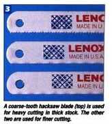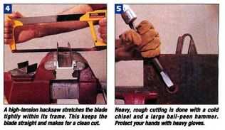 Una hoja estándar, hecha de una pieza de metal, se romperá cuando se utiliza en un marco de alta tensión de la sierra, especialmente durante el corte exigente para el cual se utiliza una sierra para metales. Para utilizar una sierra para metales correctamente, sujete el marco firmemente con ambas manos, aplique presión sobre el movimiento delantero y muy poco Levante la sierra en la carrera de retorno (foto 4). Para el corte áspero, especialmente cuando el metal no se puede cortar con una sierra para metal, utilice un cincel (Foto 5). Un cincel es una herramienta robusta diseñada para esquilar apagado metal.