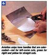 Tijeras de aviación son útiles para cortar chapa. Vienen en tres tipos codificados por colores. Aquellos con asas rojos cortan rectos o a la izquierda, aquellos con asas verdes cortan recto o hacia la derecha, y aquellos con asas amarillo hacen cortes rectos sólo (foto 6).