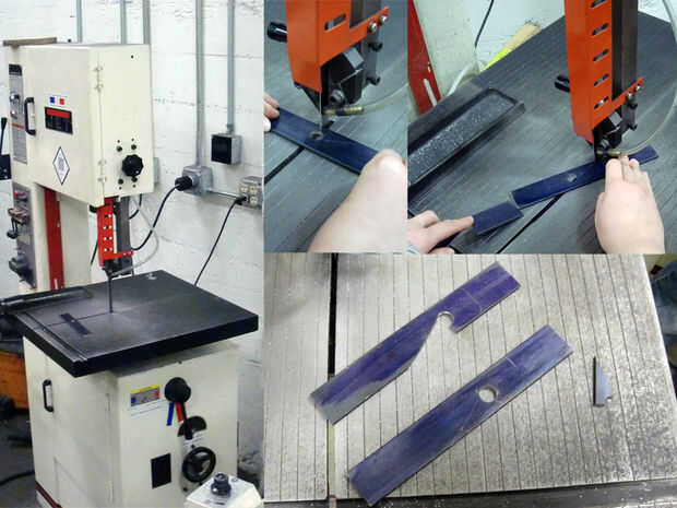 Una vez que el engranaje y la velocidad se ha establecido y se ha ajustado la altura del protector de Sierra de cinta es hora de cortar la correa de acero. Coloque la correa en la mesa de Sierra de cinta y lentamente empuje la correa en la hoja a lo largo de las líneas de corte. Go lento. Para cortes en ángulos impares use otro trozo de metal para empujar la correa a través de la sierra mientras guiando con la otra mano. Asegúrese de que los dedos estén lejos de la hoja en todo momento.