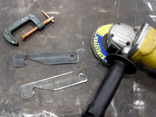 Para quitar la escala de molino, vamos a usar una amoladora angular con una rueda de la aleta. Fijar el abrelatas de botella plano sobre la superficie de trabajo y utilice la rueda de esmeril para quitar la escala. Esto crea una lluvia de chispas, así que tenga cuidado. Sólo podrás moler uno la mitad de la superficie a la vez, así que suelte su abridor muela del otro lado y voltearla más y repita.