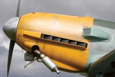 El mayor impacto visual que puede Agregar es a pincel seco algunos esmalte plateado en los bordes delanteros, que representa desgaste dañen el flujo de aire y los desechos de la prop. Un trozo de esponja o goma espuma, sumergido en la pintura y luego secó casi seco en un pedazo de tejido de la cocina, le da un lindo efecto moteado para esto. Puede añadir detalles extra superficial, demasiado (algunos marques de 109 tenían 20 mm cañón en las alas) pero he decidido no molestar - apenas otra cosa que romper entre coche y taller! Por último, para sellar el acabado superficial rocían en laca poliuretano mate, y era el.