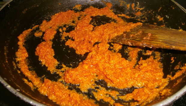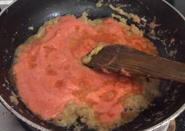 Añadir también el puré de tomate y rehogar. Mantenga sauting hasta que se reduce el contenido de agua y el tomate se cuece realmente.