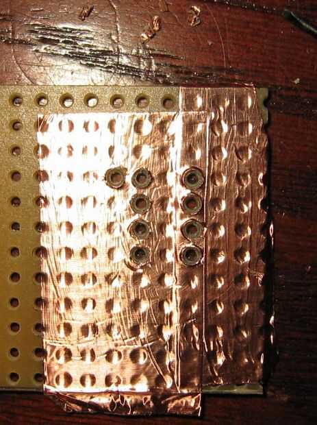 Para quitar las piezas de recorte de papel de aluminio, utilizar una aguja o un destornillador de un pequeños joyeros (visto en la parte superior de la imagen) para empujar cada pieza de corte de lámina en su orificio y por el otro lado.  Después de que se han hecho todos los agujeros necesarios, mantenga la Junta a la luz y asegúrese de que todos los agujeros estén libres de residuos.  Las piezas de recorte de papel de aluminio tienen una tendencia a pegarse al lado tira de la Junta, así que Compruebe la tira parte de la Junta y cepillar las piezas que.