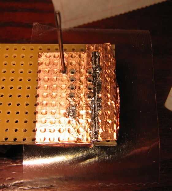 Hacer un agujero en la capa de plástico (para que un componente puede ser colocado), utilice un sharp aguja para perforar el plástico de la parte componente de la Junta y luego poco a poco baje la aguja completamente en la placa y mover para ampliar el orificio. NO USAR UN DESTORNILLADOR O UNA CUCHILLA PARA HACER ESTO!!! La razón mediante una aguja (y no con cinta que se pega) es evitar que un recorte lineal o romper. Necesitamos el plástico para forrar todo el borde del agujero, y una lagrima evitar que eso suceda y podría exponer a una porción de papel de aluminio. El objetivo es que el plástico poco a poco las curvas en el agujero y selle todos los bordes de la hoja.