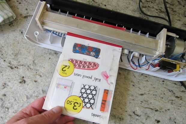 Ahora ponga la plancha a un lado (aún en el) y el paquete por los bordes y alimentar en el laminador. Va a ser muy caliente. Tienen un práctico paño.