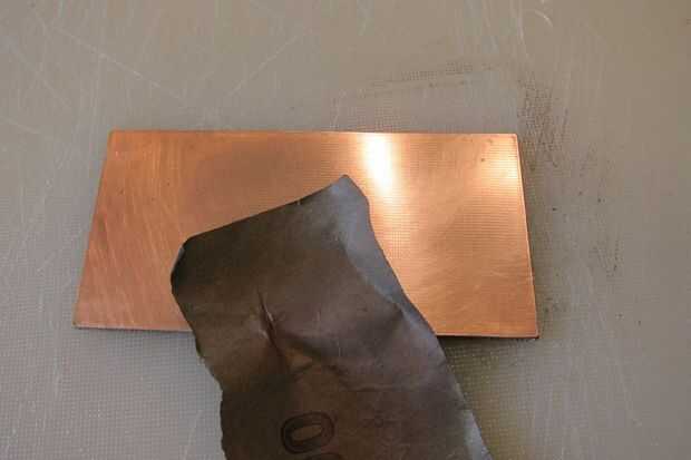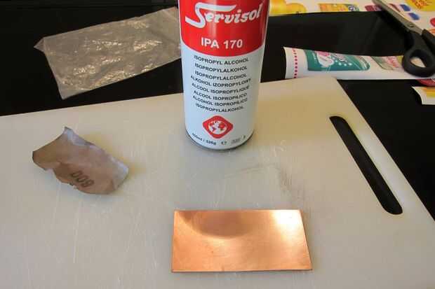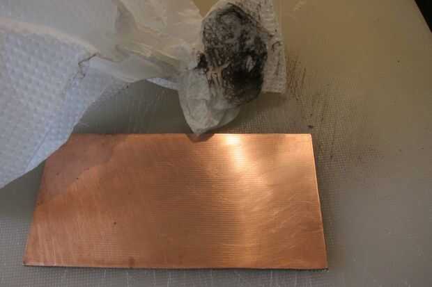 No obstante, necesitamos un tablero limpio, pero no hay que obsesionarse. Un simple frote con un pedazo de grado fino mojado y seco (papel emmery) hasta que el limpiador es shiney todo, luego una exfoliación rápida con toalla de cocina y alcohol o acetona (quitaesmalte) será suficiente. Me froto con alcohol hasta que el papel no ensuciarse más.