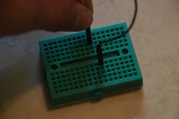 Ahora tome el alambre del pin 9 en el Arduino y fíjelo detrás el espacio no conductor en medio de la placa.
