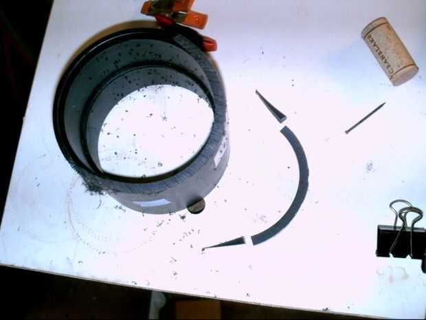 Este paso sólo es necesario si usted está haciendo un carenado parcial (un lado abierto). Tomé la decisión de construir este carenado para mi convencional reclinada (la página de introducción tiene fotos de una versión más grande para el proyecto de bicicleta de energía eólica que está casi listo) y se dio cuenta cuando lo hice que el carenado parcial quería curva hacia adentro a lo largo de los lados no compatibles (vea foto abajo). Para corregir esto, diseñé mis montajes que se extiende desde la parte inferior (ver fotos), pero la zona cerca de los pedales de punta aún quería un poco de la curva en y estaba preocupada sobre la separación. Así que lo que hice fue tomar una sección de tubería de alcantarillado de 6" ABS y cortar una pequeña media luna poco de él, que yo entonces podía pegamento a la parte inferior de la líder punta