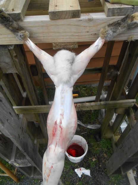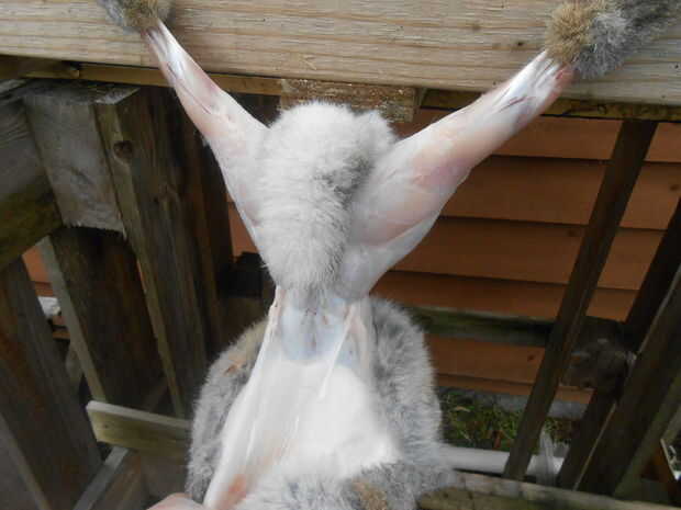 Ahora tomo el conejo de los ganchos y vuelta alrededor de modo que está de vuelta es hacia mí. Introducir el cuchillo debajo de la piel, cerca de la cola de conejo, y yo procedo a cortar la piel para que la cola y área genital se queden en el conejo, mientras que ahora se separa la piel en la parte posterior de esta sección. Una vez finalizado me agarra a cada lado de la piel y tirar hacia abajo. La piel debe deslizarse apagado, quita fácilmente como el frente de las patas y cabeza ya no existen. La piel será ahora interior y aspecto similar a una manga. Me Coloque esta a un lado por el momento y continuar con la eliminación de la carne de conejo.