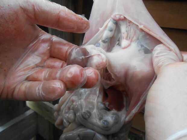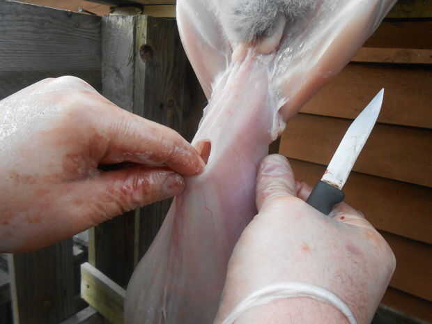 Si usted está interesado en la recolección de los órganos internos, ahora es el mejor momento para hacerlo. Como han quitado toda la carne de las secciones inferiores del conejo, cualquier error en este paso que resulta en la ruptura de los intestinos o vejiga no será desastrosa... ahora han eliminado la carne que se efectúa por goteo de líquidos. El sujetador de la membrana que cubre el estómago del conejo, con el pequeño cuchillo corté una pequeña, el agujero de 1cm, en el revestimiento del estómago. Me introduzca un dedo en este agujero y utilice para asegurarse el contenido del estómago de la hoja. Después insertar el cuchillo en el agujero con el dorso de la hoja contra mi dedo. Proceder a cortar la membrana hacia la caja torácica. No necesito el cuchillo para esta siguiente parte así que puse la cuchilla hacia abajo. Con una mano muevo suavemente los intestinos y otros órganos de la caja torácica y con el que alcanzan en y comprensión de los órganos que deseo. El diafragma necesita generalmente ser perforado, que puede hacerse con un firme poke del dedo. Los órganos son generalmente capaces de eliminar con un fuerte tirón. Éstos entonces se fijan a un lado y el contenido del estómago pueda para caer en la caja torácica.