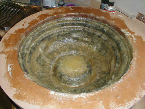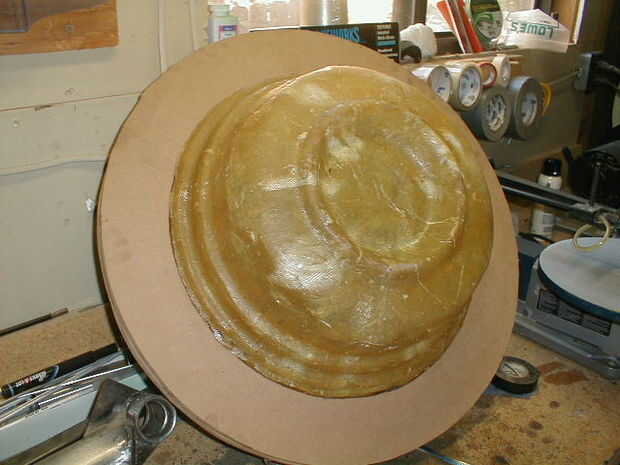 Luego empecé a sentar encima de mi fibra de vidrio (utilizado CSM para esto) en la rueda de repuesto con cinta. La fibra de vidrio se aplicó para que traslapó la superficie superior del anillo MDF. Esto hizo el acabado había moldeado bañera mucho más fuerte y hace mucho más fácil sacar la llanta de repuesto después del moldeo.