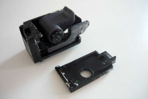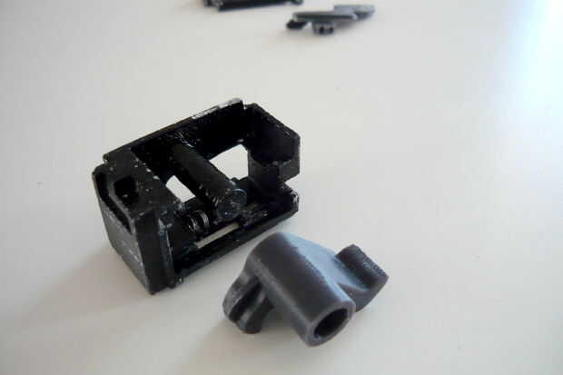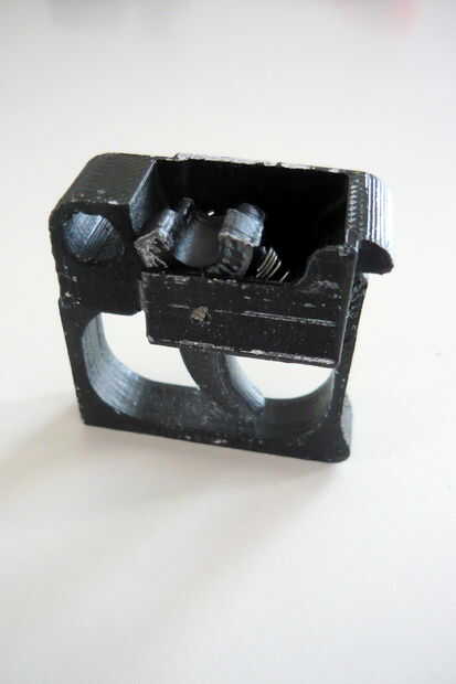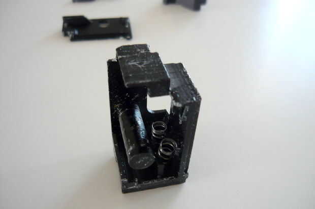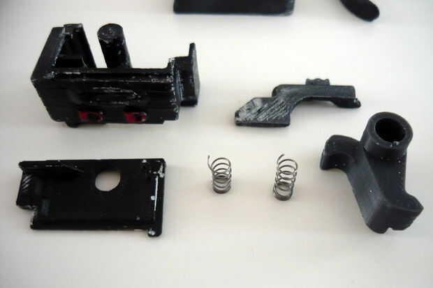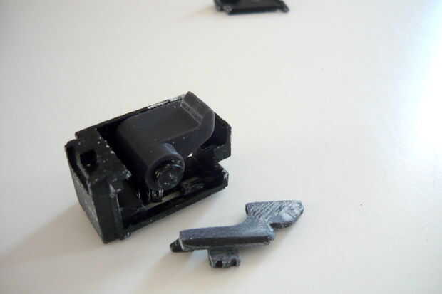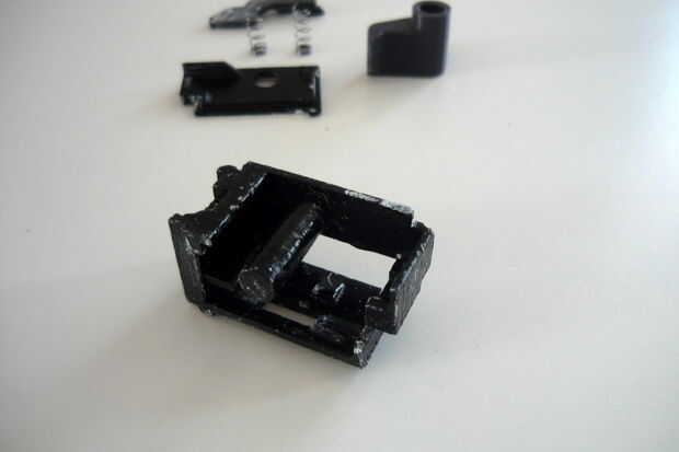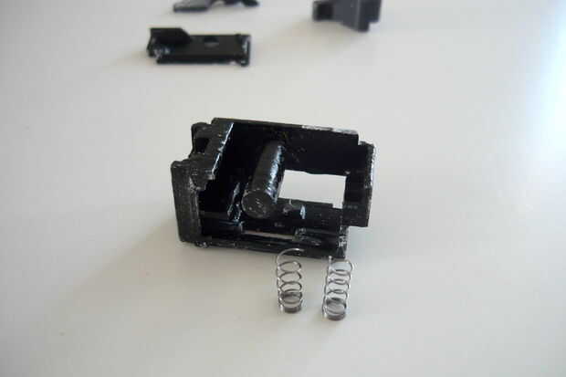 La caja de disparo está dividida en dos partes, uno sostiene el sear, el otro tiene el gatillo. Un enlace se inserta en el receptor luego que conectará los dos.