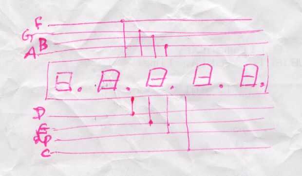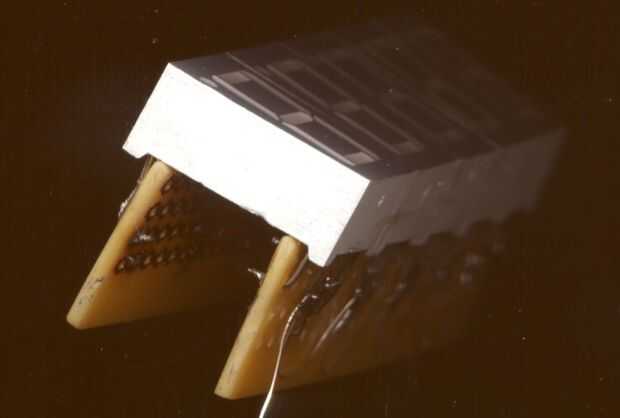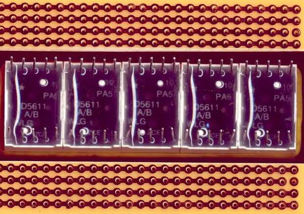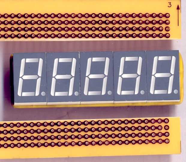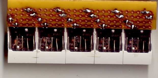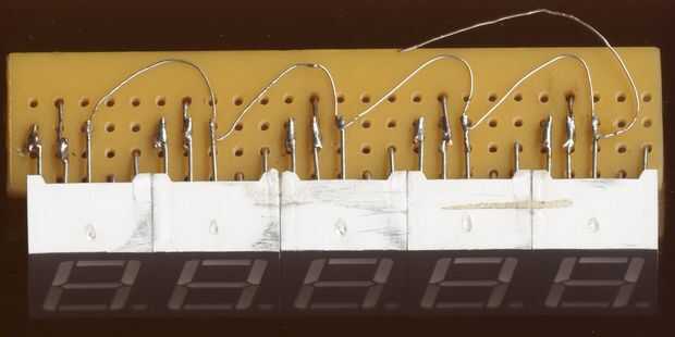 Las cinco exhibiciones fueron alineadas y pegadas con superglue. Luego utilizaron dos tiras de placa de circuito con rayas paralelas (veroboard), conectando segmentos similares juntos. Los cátodos de las pantallas no están conectados en este momento.