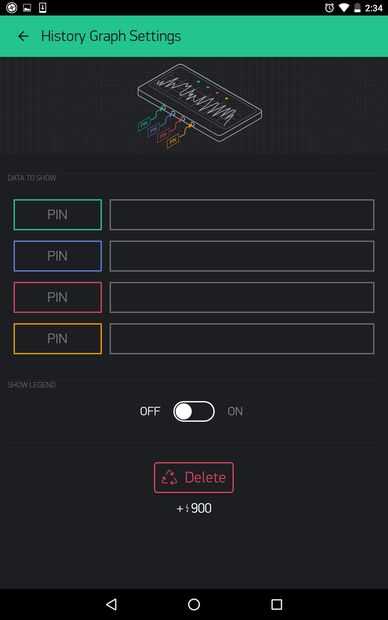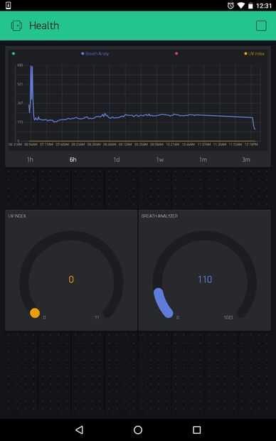 Gráfico de la historia para almacenar datos cuando se conecta el llavero con tu smartphone. Incluye 4 entradas, pero sólo utiliza dos, uno para el índice de UV (seleccione pin Virtual V0) y otra para el índice de alcohol (seleccione pin Virtual V1).