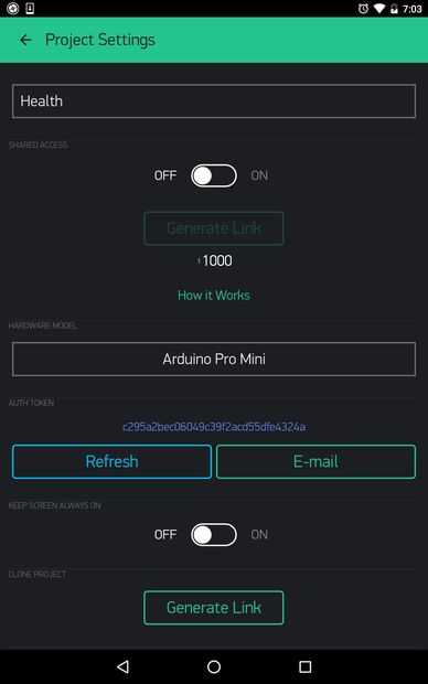 Este proyecto está a sólo 1500 "energía" para ejecutar. Al principio que deberás iniciar un nuevo proyecto con nuevo nombre y seleccione Hardware modelo es Arduino pro mini, entonces usted debe conseguir código de Token de autenticación que usted entrará en el programa en el Arduino. Una vez que se ha creado el nuevo proyecto, agrega el widget box incluye: una historia gráfica, dos de calibre.