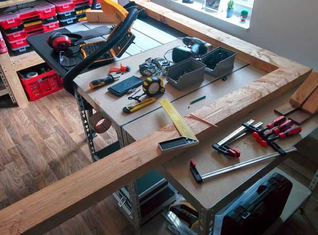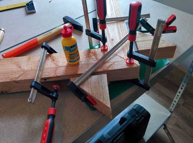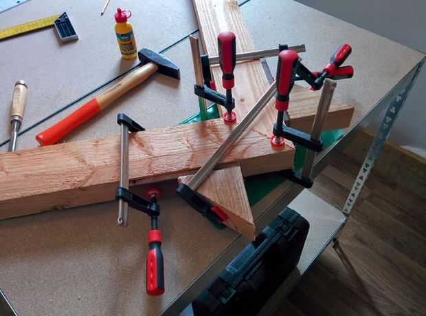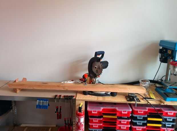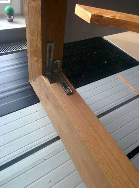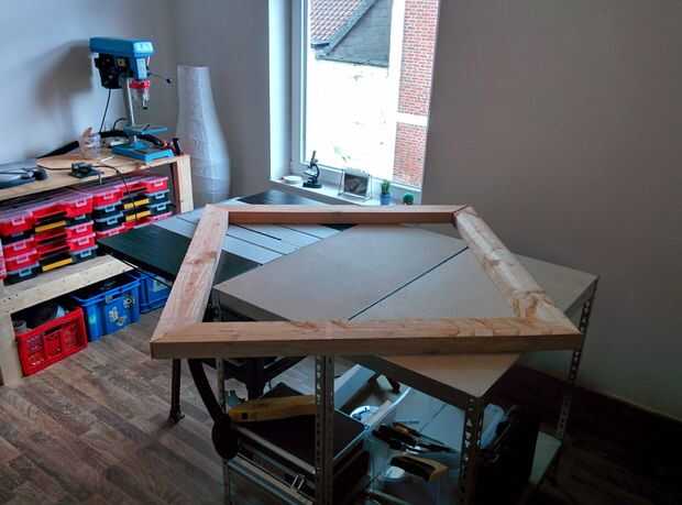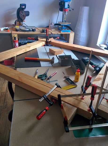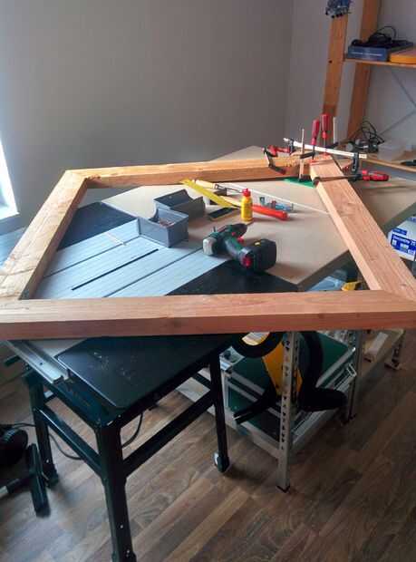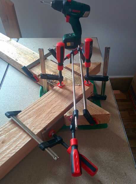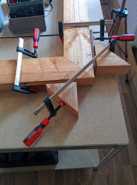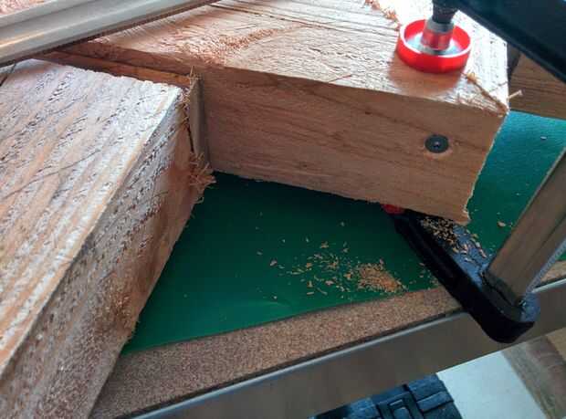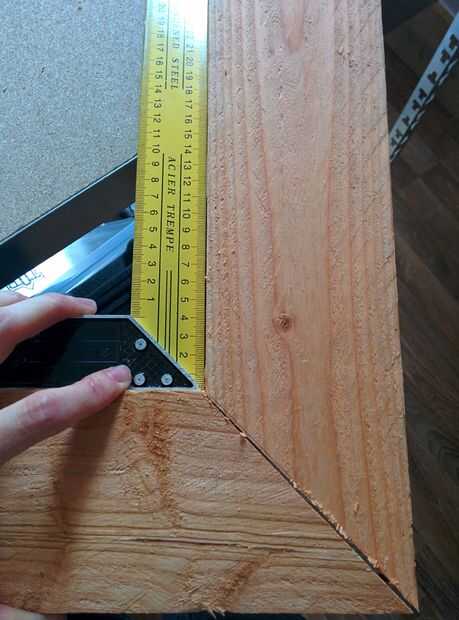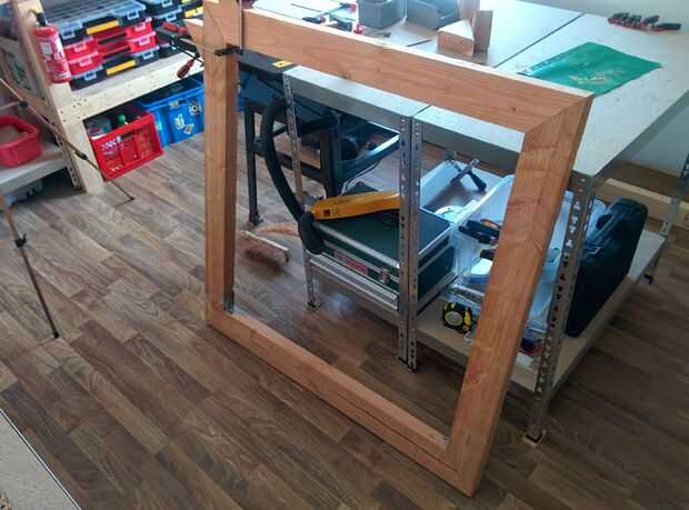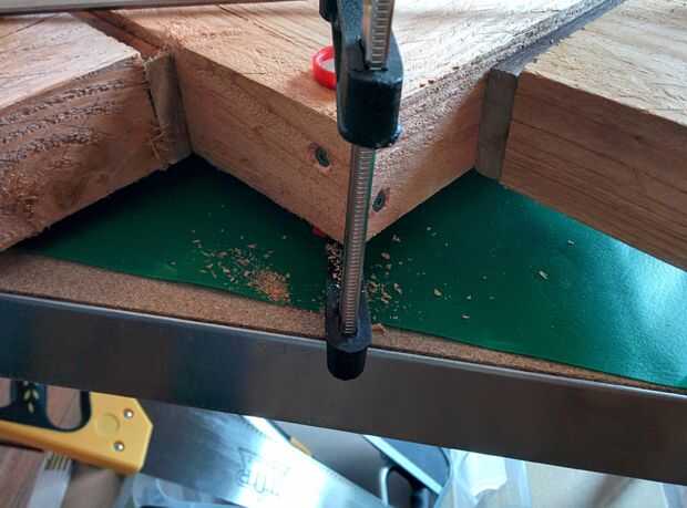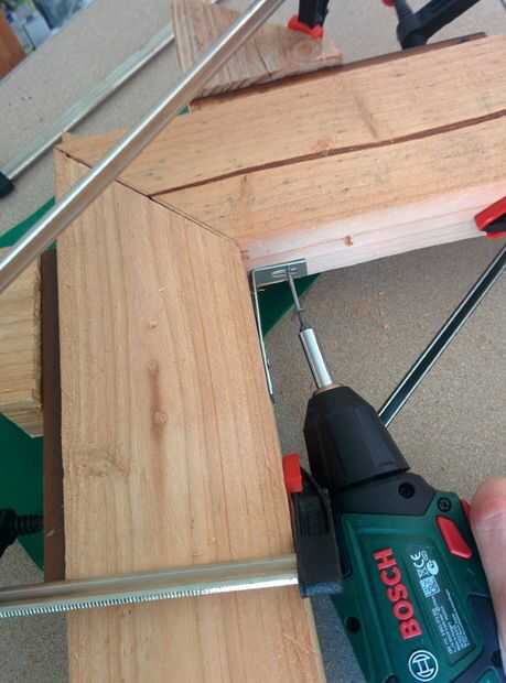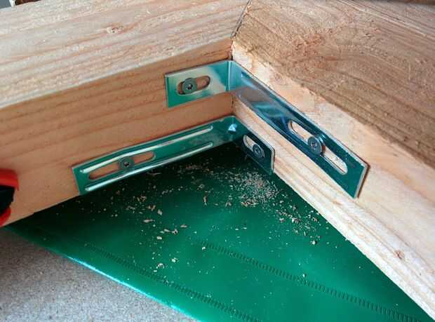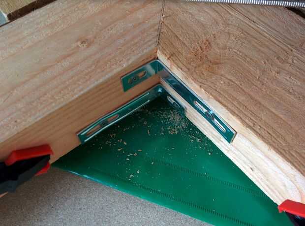 El marco inferior está hecho de resistente 150 mm por vigas de 50 mm. Estas vigas se redujeron a 110 cm, con esquinas a inglete en la sierra para cortar ingletes. Las juntas fueron pegadas y atornilladas juntos. En lugar de utilizar tornillos largos para ajustar el interior de las esquinas, usé L-brackets. Estos soportes estarán en el interior de la parte inferior de la maceta y no será visibles.