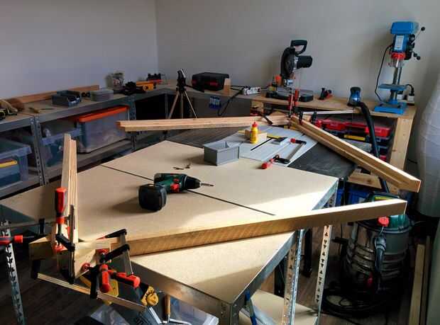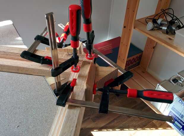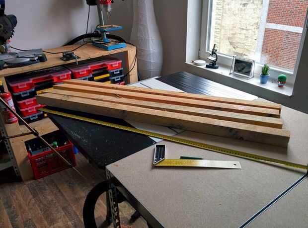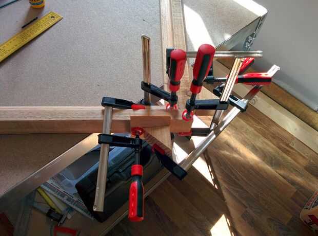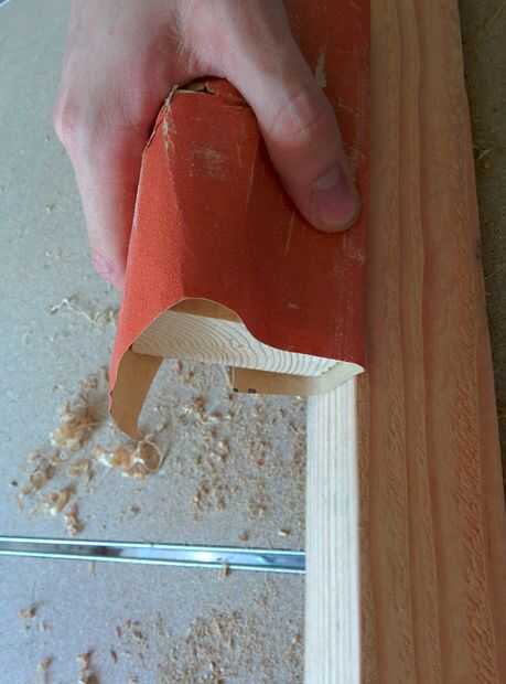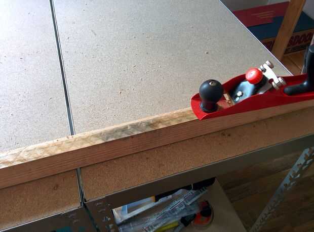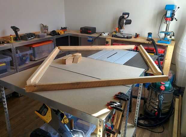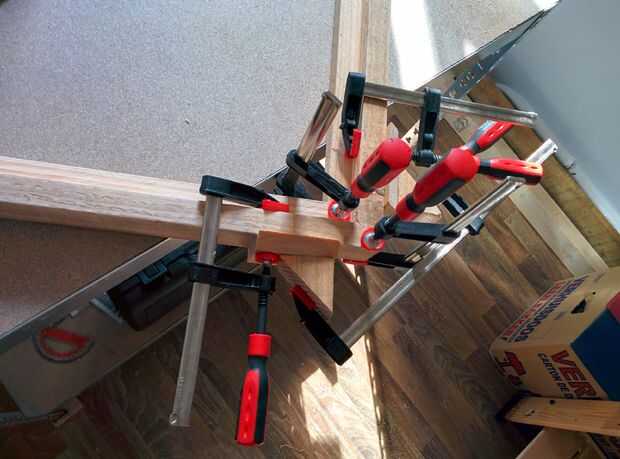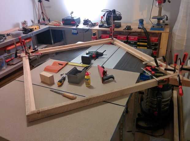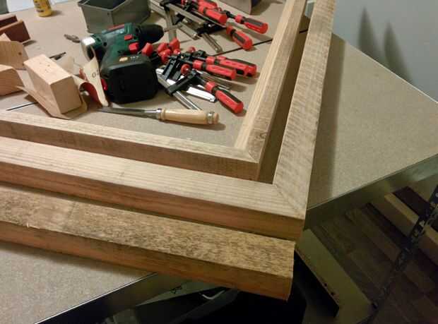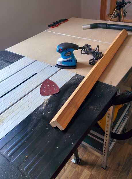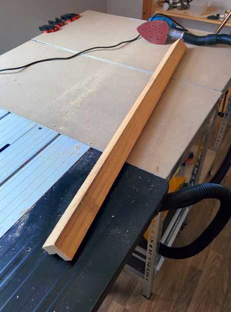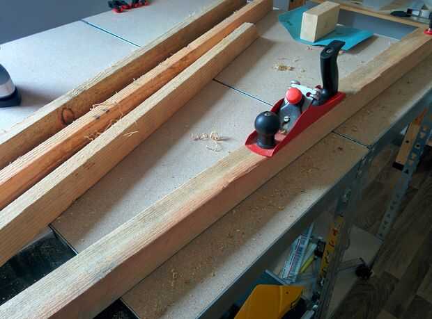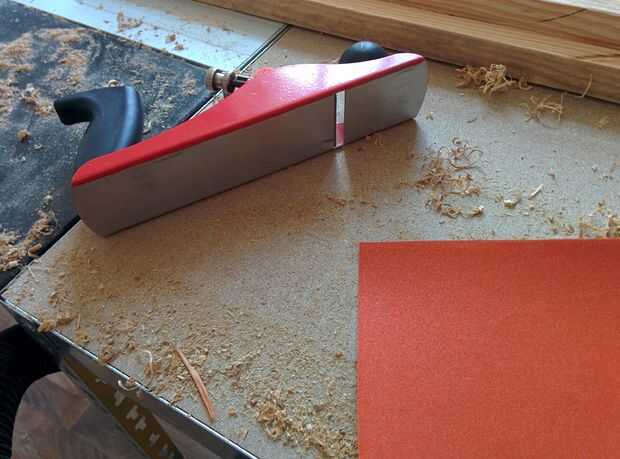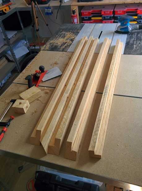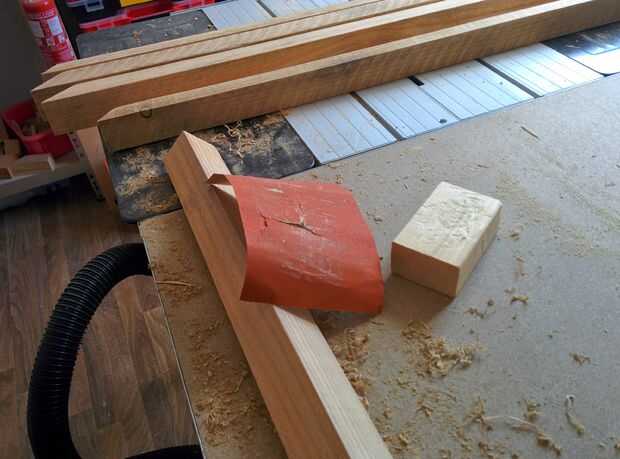 Los ingletes fueron cortados en la sierra y la barbilla en la Sierra de mesa. Alisó estas piezas con un plano de la mano y una lijadora eléctrica (80 grano). Terminé de alisado a mano con lija de grano 120.