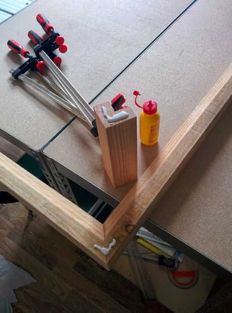 Las esquinas se cortan a la longitud en los ingletes, lijado y pegado a la parte superior del marco.