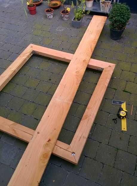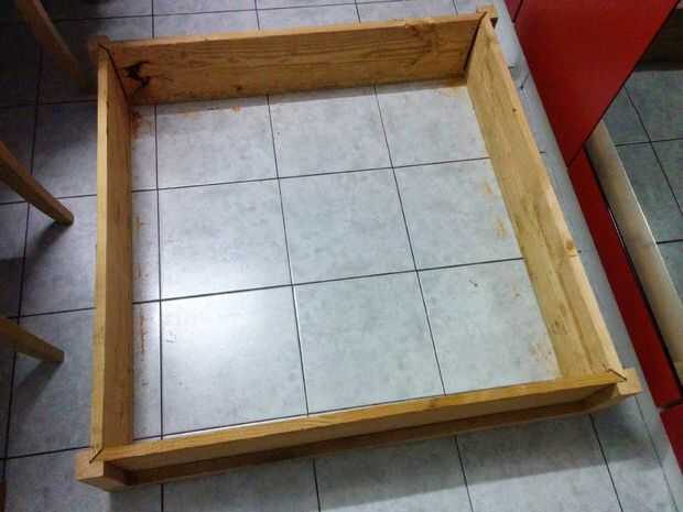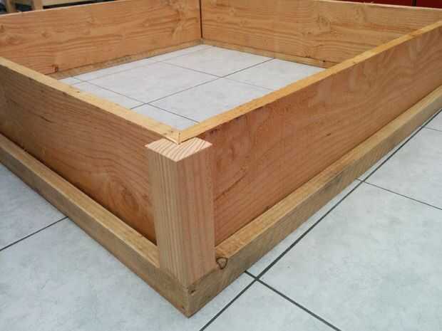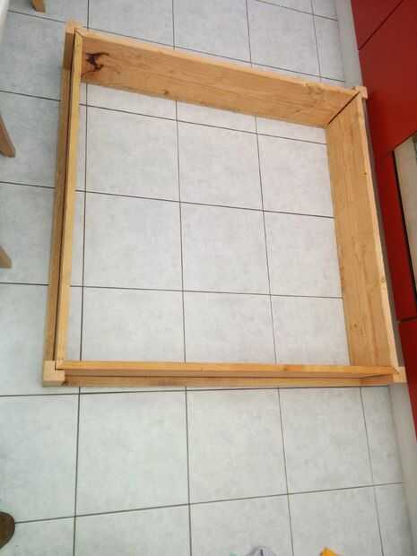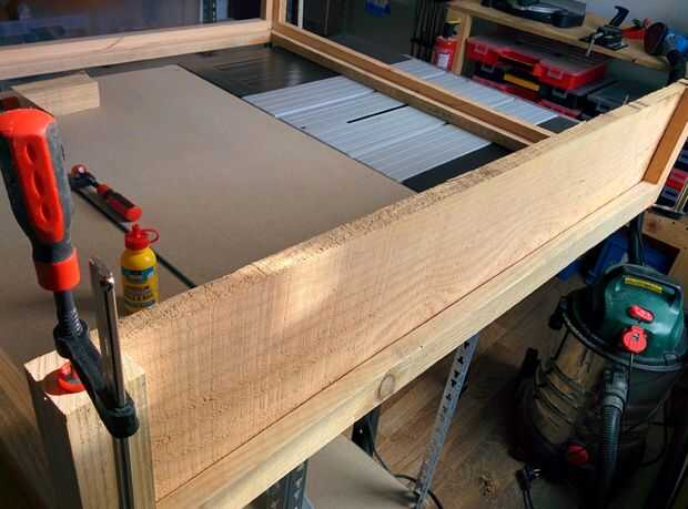 Corte las tablas para los costados y parte inferior a la longitud fuera con una sierra circular. los cuatro fueron inglete en la Sierra de mesa y atornillado en las esquinas con un lote de tornillos y parte superior del marco.