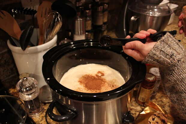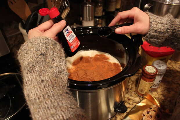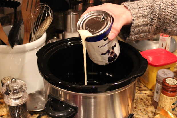 Con la olla abierta, verter en las latas de leche evaporada. Cerciórese de agite antes de abrirlos en caso de cualquier cosa dentro separados (bruto). Luego agregar canela, extracto de vainilla y nuez moscada.