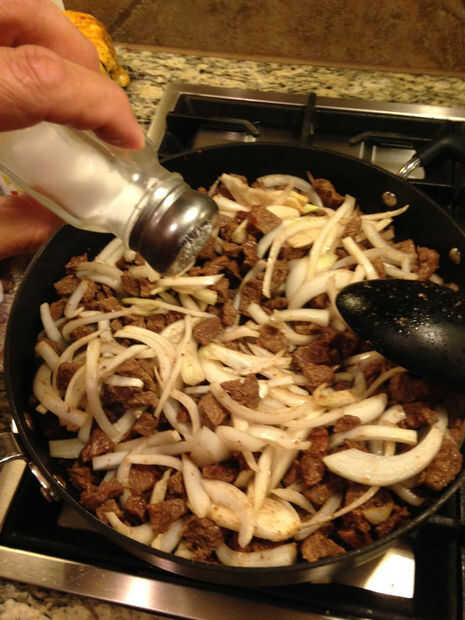 Después de que las cebollas estén transparentes. Añadir sal al gusto. He añadido 1 cucharadita de sal a la mezcla de cebolla la carne. Se puede ajustar a su gusto.