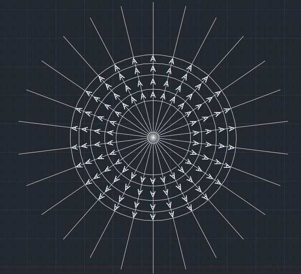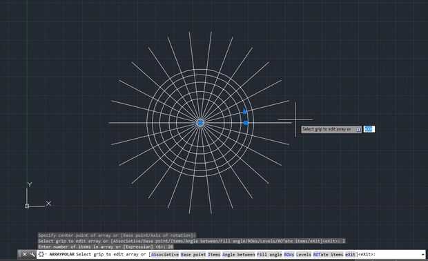 7. escribe arraypolar y elija la línea que hiciste y los cuadros de texto A, golpe entra y haz clic en el punto central de todos los círculos (basepoint), deben saltar unas líneas. Desea seleccionar los elementos. Continuación, escriba el número de divisiones, es decir 26. Va escuchar su selección ahora presiona enter.