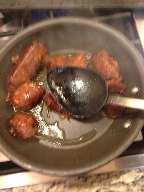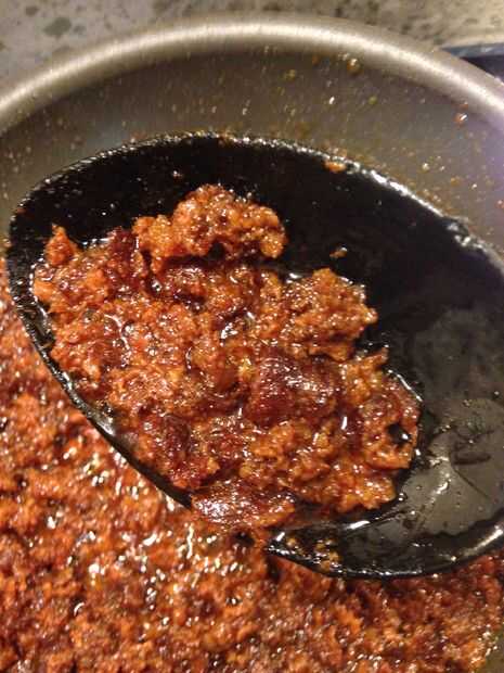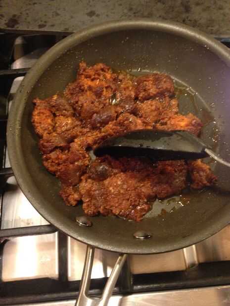 Mi papá ha conquistado el tiempo para cocinar el chorizo y patatas en la misma sartén. Tengo no - cocino él separado. En una sartén pequeña 8 pulgadas lo pongo a fuego medio. Después se calienta la sartén, añadir 1 cucharada de aceite vegetal. Luego añades los enlaces de Chorizo (cubierta quitada). Usando la parte inferior de la cuchara, romper el Chorizo por lo que se cocina bien. Porque el Chorizo que utilicé fue curado (no tan húmedo) - tuve que usar el borde de la cuchara para cortar el Chorizo. Cocine la it hasta que se ve como un color Carmel como se ilustra.