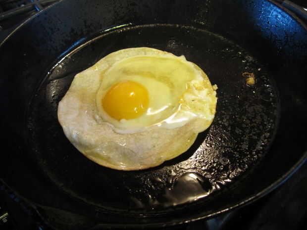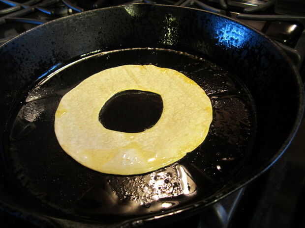 Calentar una sartén a fuego medio. Cepille ligeramente la sartén con aceite de oliva, también ambos lados de la tortilla. Con un cuchillo, cortar un círculo desde el centro de la tortilla. Coloque la tortilla en la sartén (debe Arden un poco), el pedazo de recorte junto a.