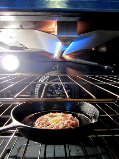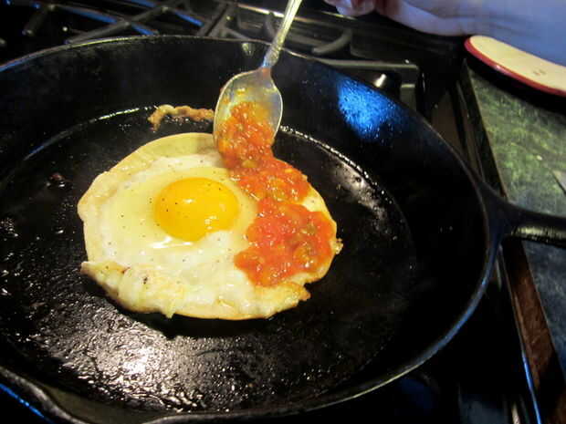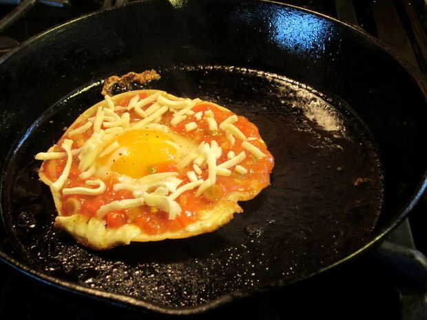 Suavemente organizar pequeñas cucharadas de la salsa alrededor del huevo, Espolvorea la salsa con queso. Cuando la parte inferior de la tortilla es de oro, transferir la sartén a la parrilla para terminar la cocción del huevo.