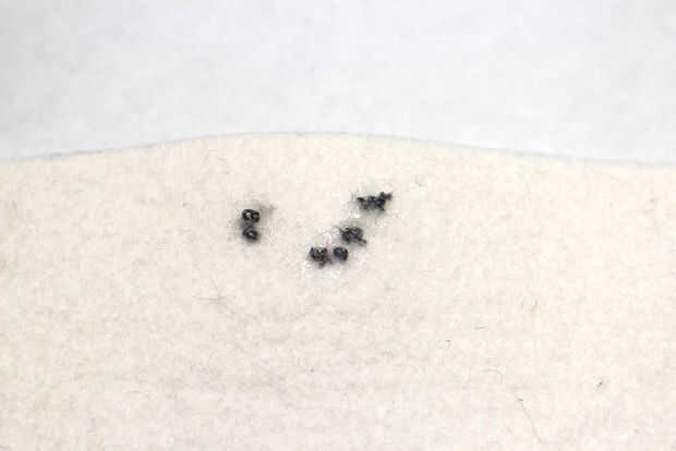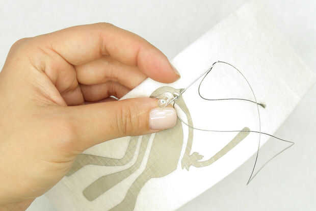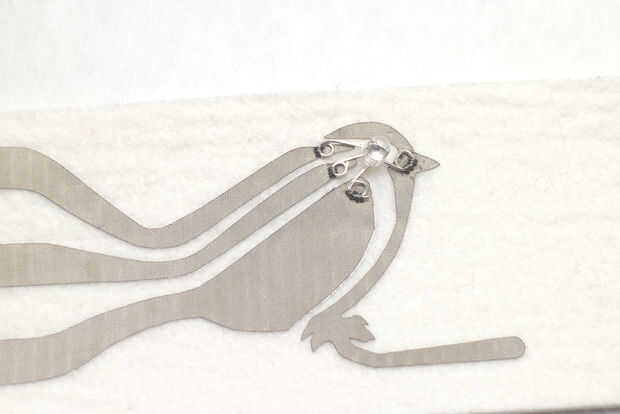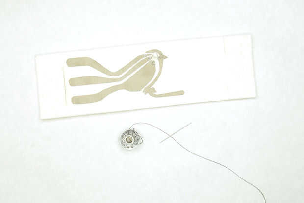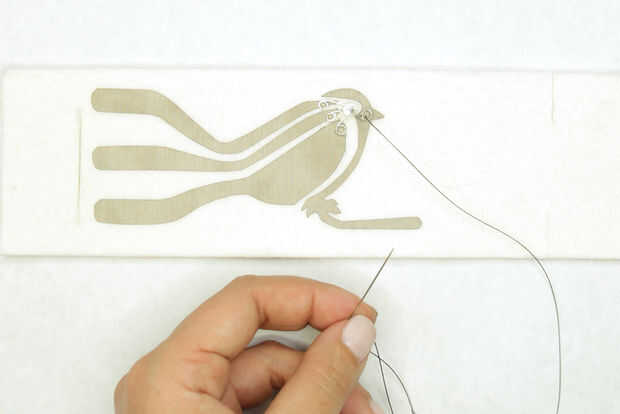 Enhebrar una aguja con aproximadamente 18" de hilo conductor y hacer un nudo al final. Enhebre la aguja a través del fondo de fieltro, piercing a través del tejido conductor en la parte superior. Si la aguja no es ya a través de la pata lazo rizada creaste, pase a través. Hacer varias puntadas apretadas, pequeños va alrededor del lazo y a través del tejido conductor y sentido. Hacer al menos 6 puntos de sutura. Es importante hacer una buena y segura conexión entre el LED y el rastro de tela conductora. Acabado y nudo en la parte inferior. Hacer esto para el resto de los conductores.